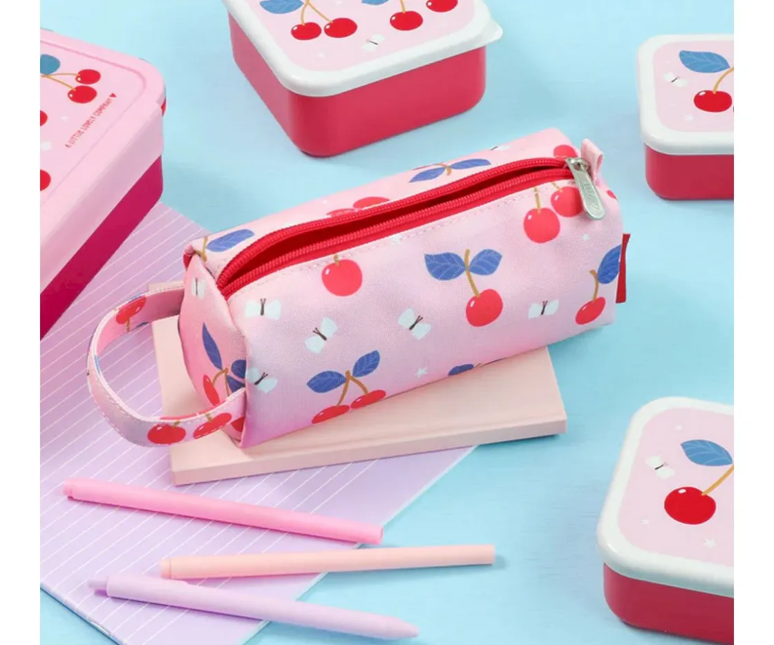 Precioso estuche escolar con dulce estampado de cerezas para que los peques lleven todos sus lápices y material que necesiten en un solo lugar. Está forrado por dentro, cuenta con cierre de cremallera y un asa lateral para que lo puedas transportar fácilmente.