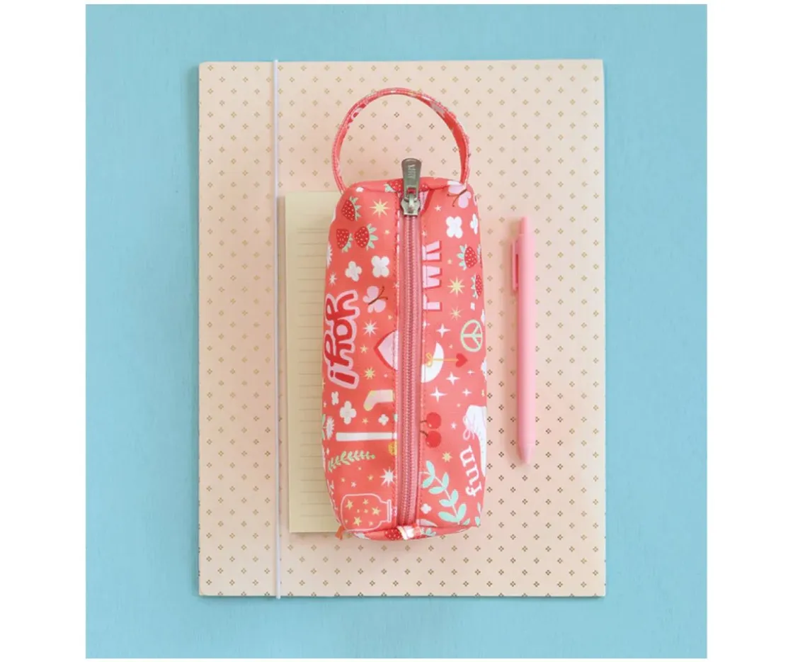 Precioso estuche decorado con fresitas para que los peques mantengan todos sus lápices seguros en un solo lugar. Está forrado por dentro, cuenta con una cremallera en la parte superior y una práctica correa para transportarlo