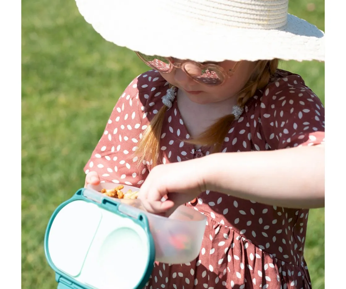 Con la caja almuerzo snack de B.Box, la merienda se vuelve más fácil y práctica. Cuenta con un compartimento flexible que permite llevar frutas enteras sin cortarlas, cómo por ejemplo una manzana. Y su otro compartimento, permite llevar snacks o salsas y yogures, sin preocupaciones.
