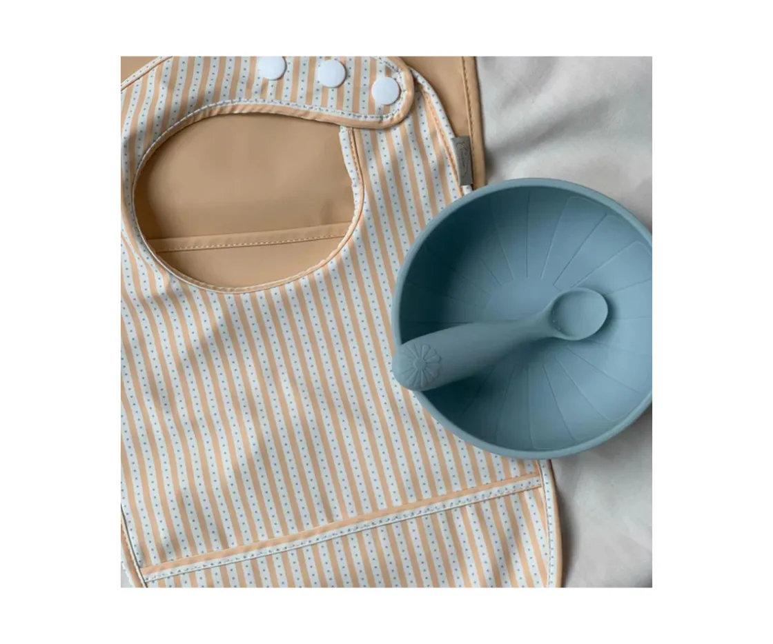 Facilita las comidas de tu bebé con este set de dos baberos lavables con bolsillor recogemigas en la parte delantera y que se ajustan cómodamente gracias a su dos cierres de polleras en su parte posterior. Son impermeables y encontrarás un diseño estampado y otro liso.
