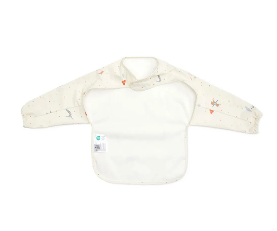 El babero con mangas Cam Cam Carousel, es impermeable y tiene un práctico bolsillo en la parte delantera que lo atrapa todo.