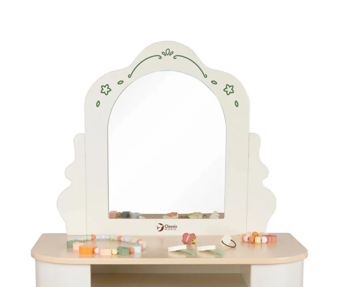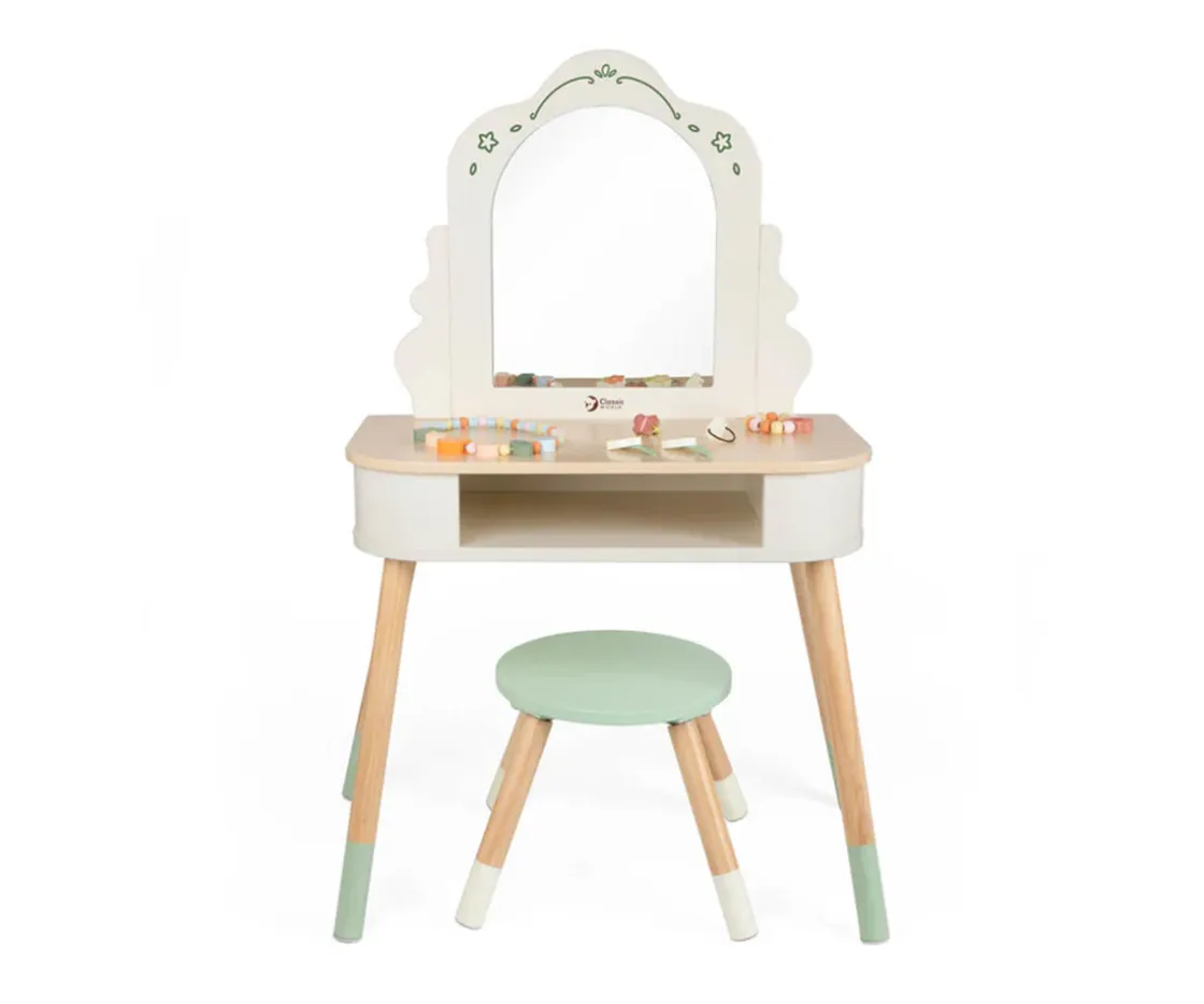 Adorable tocador de madera con taburete y accesorios, en el que los peques podrán recogerse el pelo como los mayores e inventar todo tipo de aventuras.