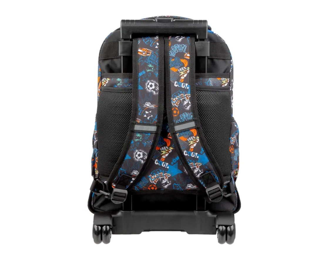 Su diseño con carro integrado, doble barra y tirantes acolchados la hace muy versátil, perfecta tanto para llevarla rodando como a la espalda. Cuenta con dos compartimentos principales de gran tamaño, su base es rígida y resistente, protegiendo el contenido contra golpes, mientras que los dos bolsillos laterales permiten llevar botellas de agua de forma segura.