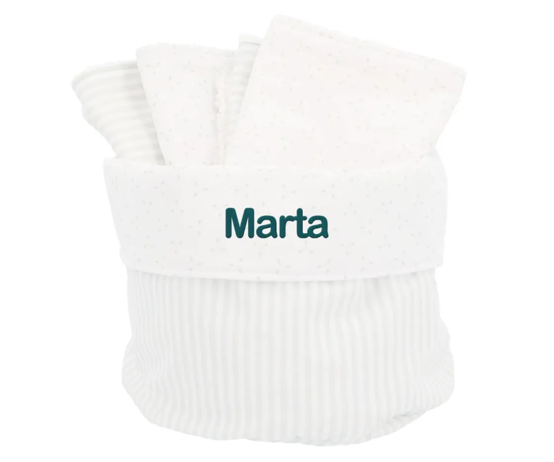 Cesta organizadora de tamaño pequeño para poder colocar y tener a mano, las cremitas y los pañales del bebé. Incluye 4 toallitas secababitas a juego con la colección Dorset Verde.