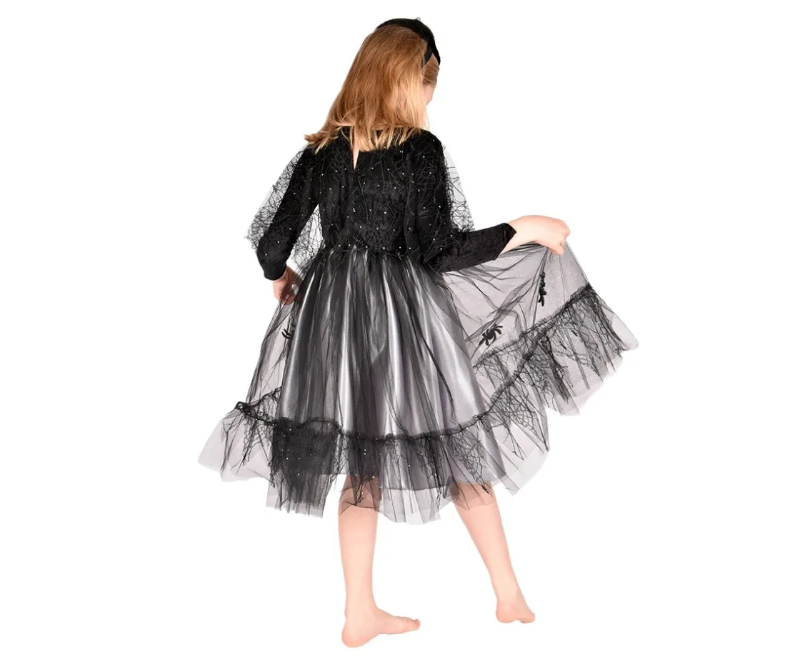 La parte superior del vestido está confeccionada en terciopelo negro suave con una bolero cosido en forma de telaraña brillante, decorado con pequeñas piedras plateadas. La falda está formada por dos capas: una falda inferior de satén plateado y una sobrefalda de gasa negra con adorables detalles de arañas brillantes.