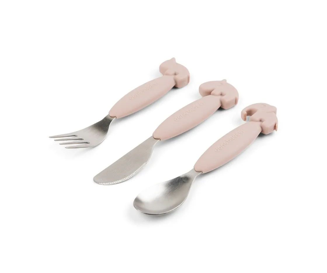 Set de cubiertos compuestos con cuchara, cuchillo y tenedor de silicona para un sencillo agarre para manos más pequeñas