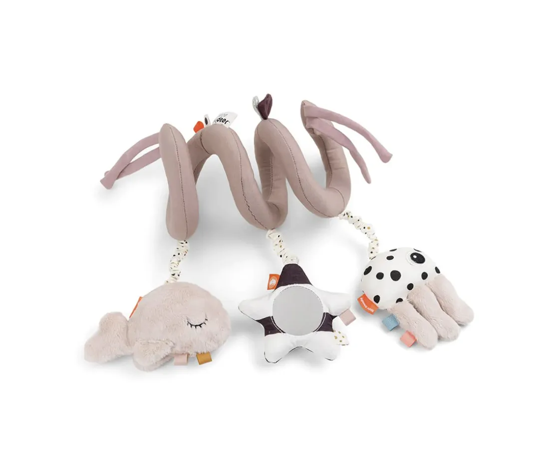 Espiral flexible que puedes sujetar a la cuna, asiento del coche, cochecito o en el lado del parque de juegos. Podrá interactuar y descubrir los sonidos con la bonita medusa Jelly, la dulce ballena Wally y con el divertido espejito en forma de estrella.