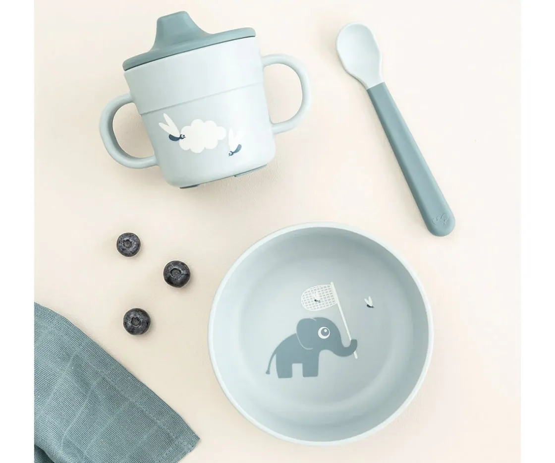 Los pequeños disfrutarán de cualquier comida servida en este conjunto de vajilla de silicona con motivos del dulce elefante Elphee. Está diseñada para que su uso sea cómodo y fácil, con agarres y boquilla en su taza y con base antideslizante en el bol para que puedan comer sin peligro a que se derrame la comida.