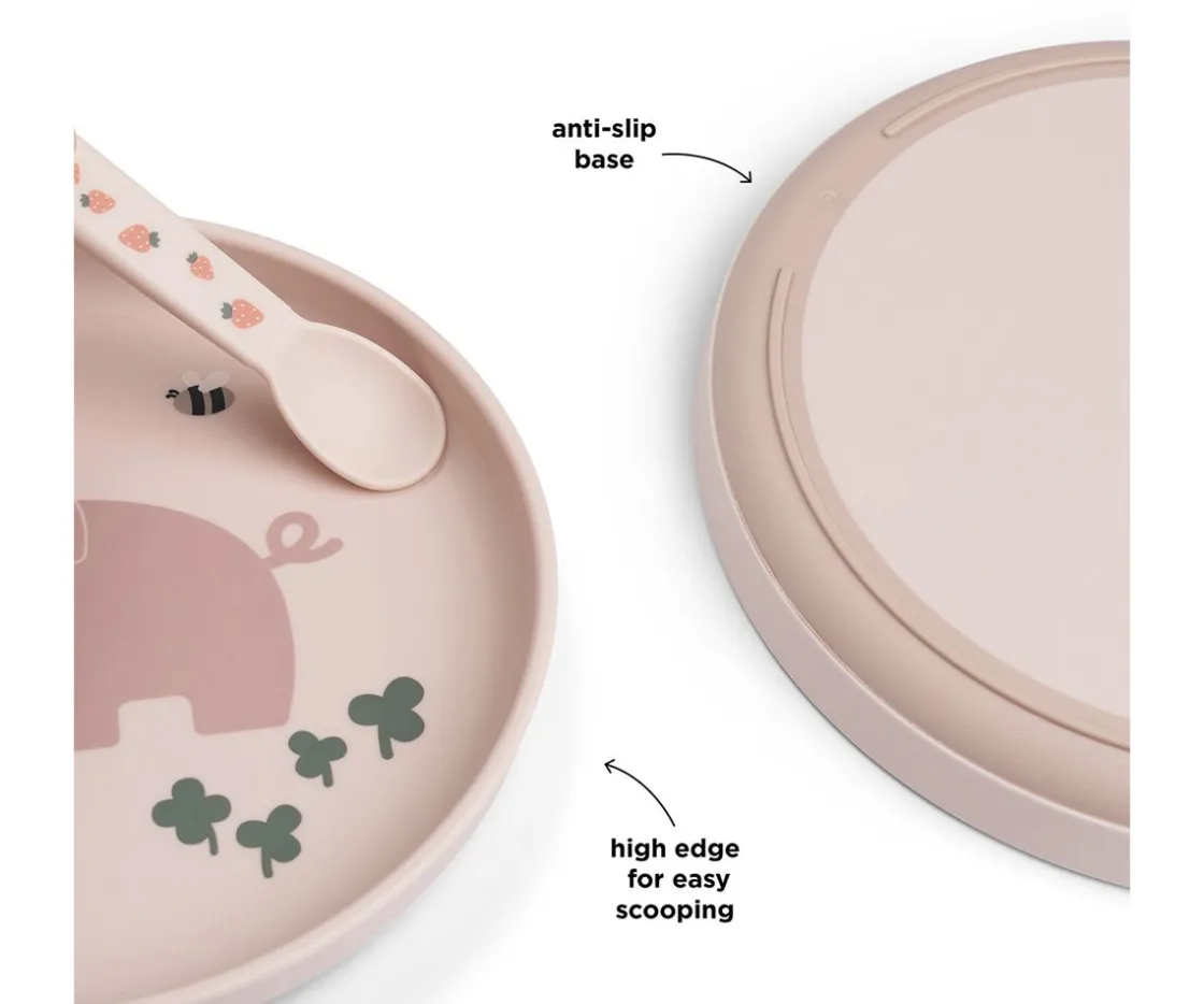 Divertido plato con el diseño del adorable cerdito Pigee, de la colección Tiny Farm de Done by Deer. Tu peque disfrutará de la comida gracias a que la base del plato incluye un anillo de silicona para no resbalar en las superficies y con sus bordes altos podrá agarrar con comodidad los alimentos.