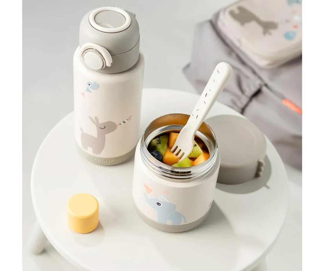 El termo para alimentos sólidos o purés de Done by Deer es de acero inoxidable y mantiene la comida caliente o fría hasta por 6 horas, con un cambio gradual de temperatura con el tiempo.