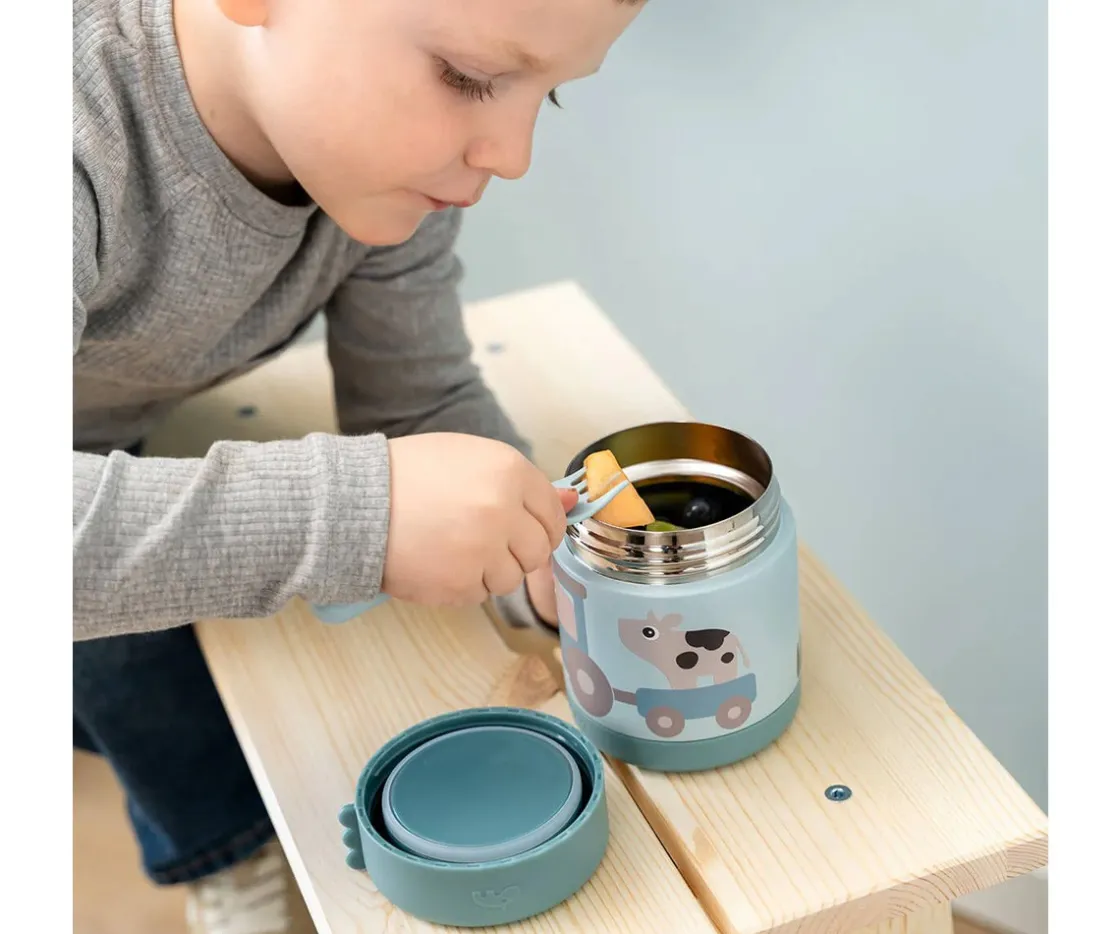 El termo para alimentos sólidos o purés de Done by Deer es de acero inoxidable y mantiene la comida caliente o fría hasta por 6 horas, con un cambio gradual de temperatura con el tiempo.