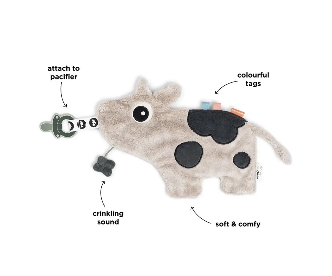 Este dulce chupetero de la colección de Done by Deer, es una adorable vaca con diferentes etiquetas y texturas para despertar la curiosidad de tu bebé y que pueda llevar el chupete bien agarrado de manera segura.