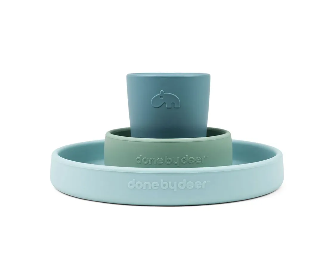 Esta vajilla de 3 piezas hará que cualquier hora de la comida sea divertida acompañados por los animales que podrán encontrar en ella, un plato Croco Azul, un bol nube verde y un vasito azul.