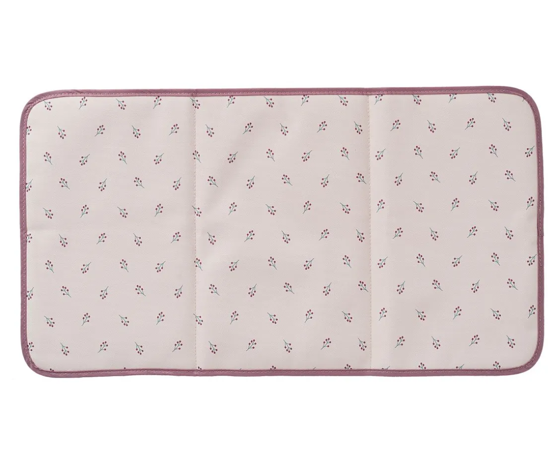 Este bonito bolso cambiador está equipado con todo lo que necesitas para cuidar de tu peque fuera de casa. Tiene un cómodo bolsillo para meter las toallitas y espacio suficiente para guardar hasta dos pañales. Incluye un cambiador plegable con el bonito diseño de grosellas de Fresk.