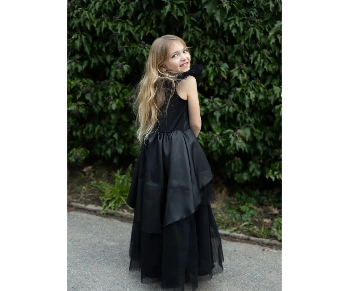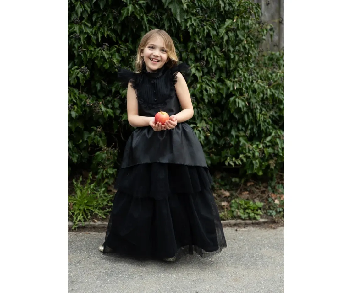 Con un diseño inspirado en el encanto gótico, este vestido negro destaca por su cuello alto con tres botones vintage, mangas de tul suave y un corte cómodo que invita a jugar, bailar y lanzar hechizos con libertad.