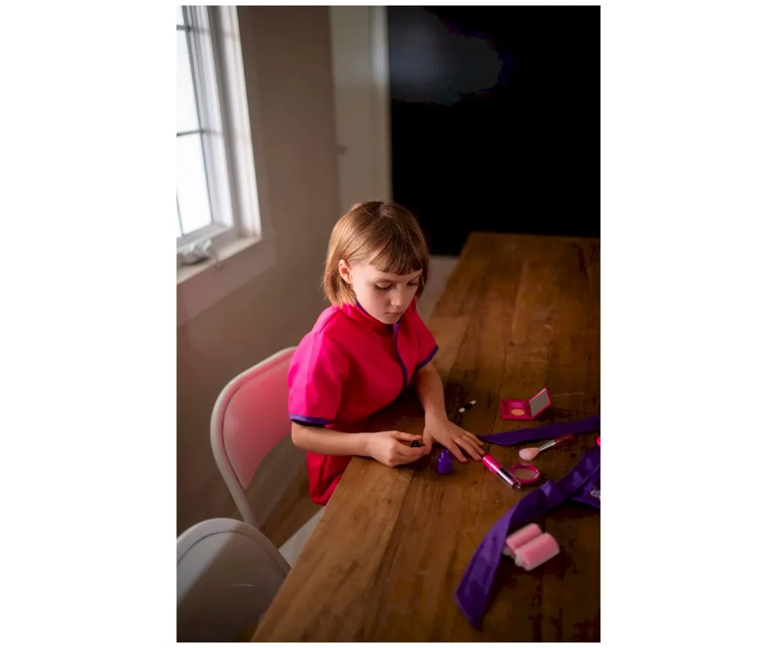 - Incluye: una bata de laboratorio rosa y morada, un cinturón de accesorios, un lápiz labial, un esmalte de uñas,una sombra de ojos, una brocha con purpurina, una brocha de maquillaje, rulos y un peine.