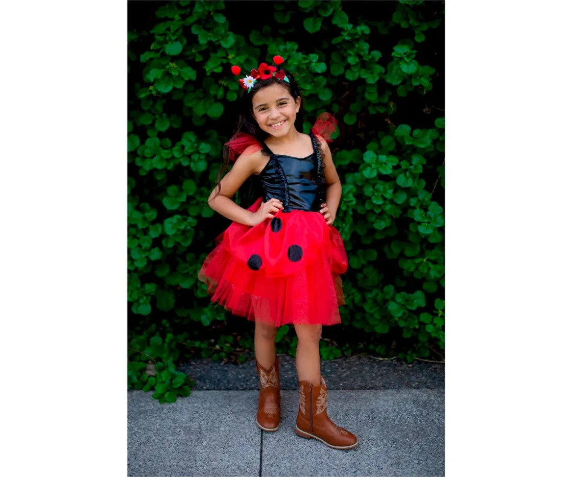 Vestido con un corpiño negro con detalle de joya roja y una falda de tul rojo con manchas negras, que incluye una preciosa diadema con antenitas de mariquita.