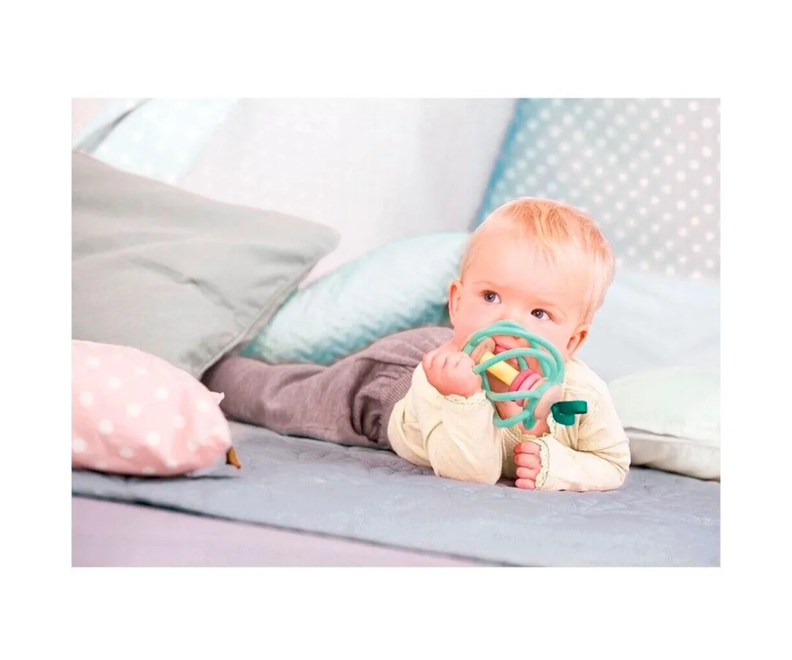 Original sonajero-mordedor hecho de silicona y madera ideal para el proceso de dentición de los peques, además el sonido de traqueteo que se esucha al agitarlo entretendrá a los peques .Su tamaño es perfecto para que puedan manejarlo las manos más pequeñas.