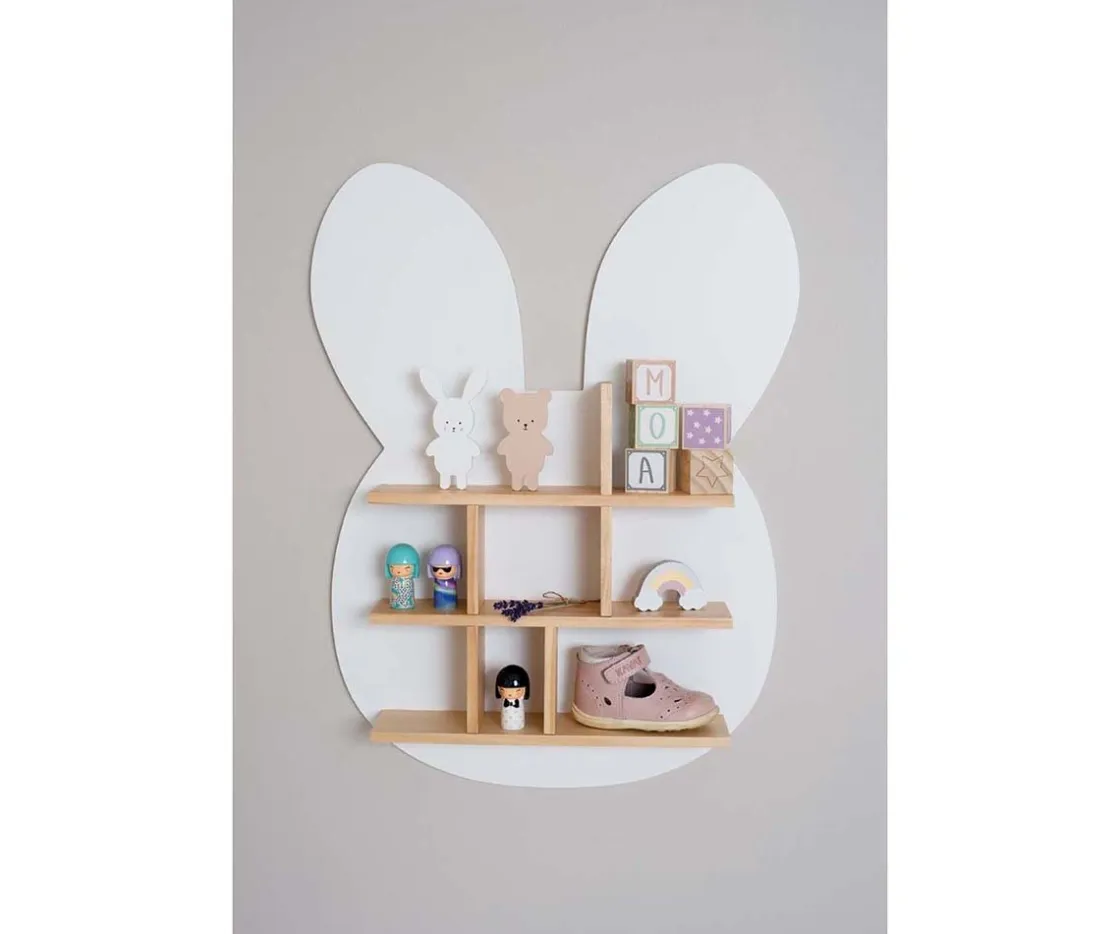 Original estanteria con forma de Conejo elaborada en madera y pintado en color blanco, con diferentes compartimentos para meter juguetes o libros