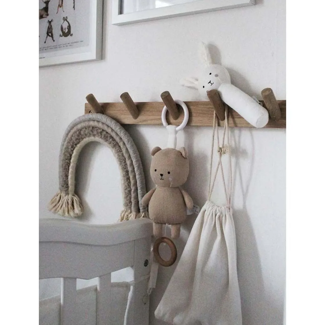 Teddy es un peluche precioso que lucirá en la habitación de nuestro peque y que, con solo tirar de su anillo de madera, conseguiremos que el peque se relaje al son de su música.