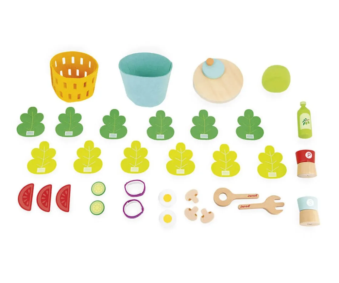 Los peques aprenderán a comer sano desde muy temprano a la vez que juegan con este original juguete de imitación. Tendrán que combinar los ingredientes de madera y fieltro para preparar la mejor ensalada mixta.