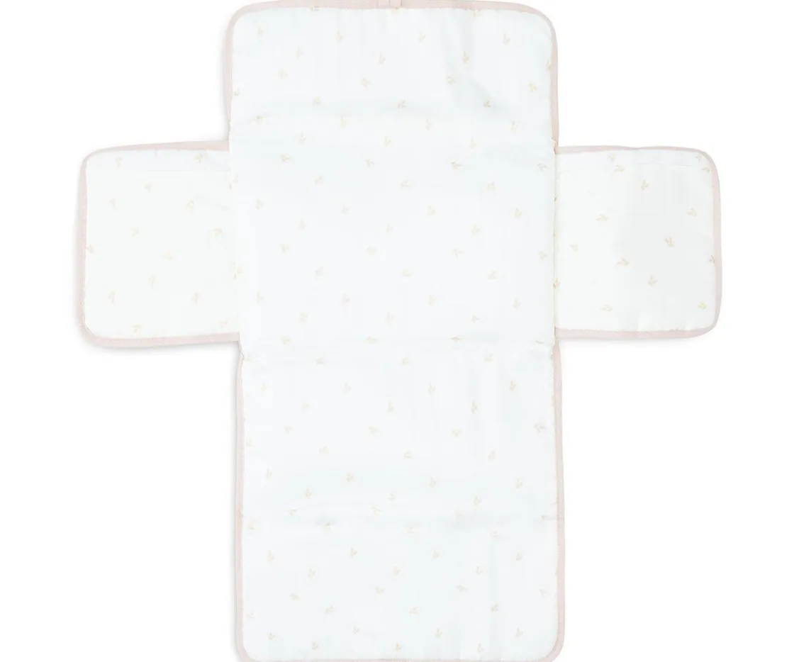 Cambiador de muselina compacto y práctico, ideal para llevar en el bolso. Exterior de tejido hidrófilo suave, interior estampado y cierre con lazo.