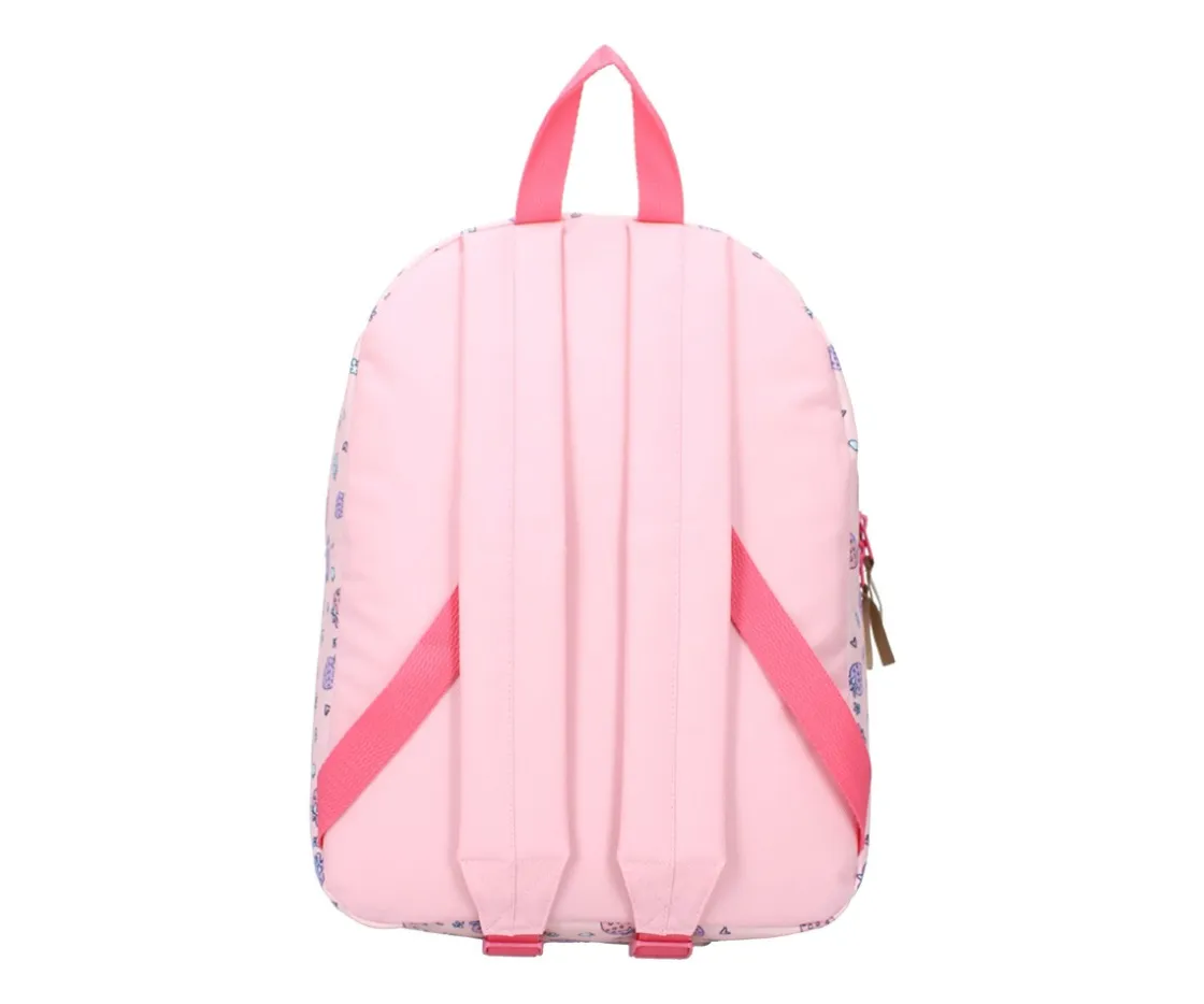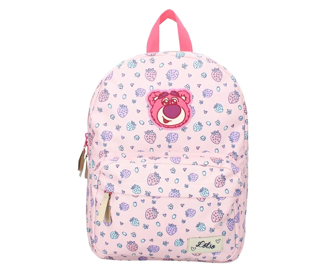 Kidzroom presenta la mochila decorada con el osito más rosita Lotso, que cuenta con un espacioso compartimento principal con cierre de cremallera y un pequeño bolsillo frontal.