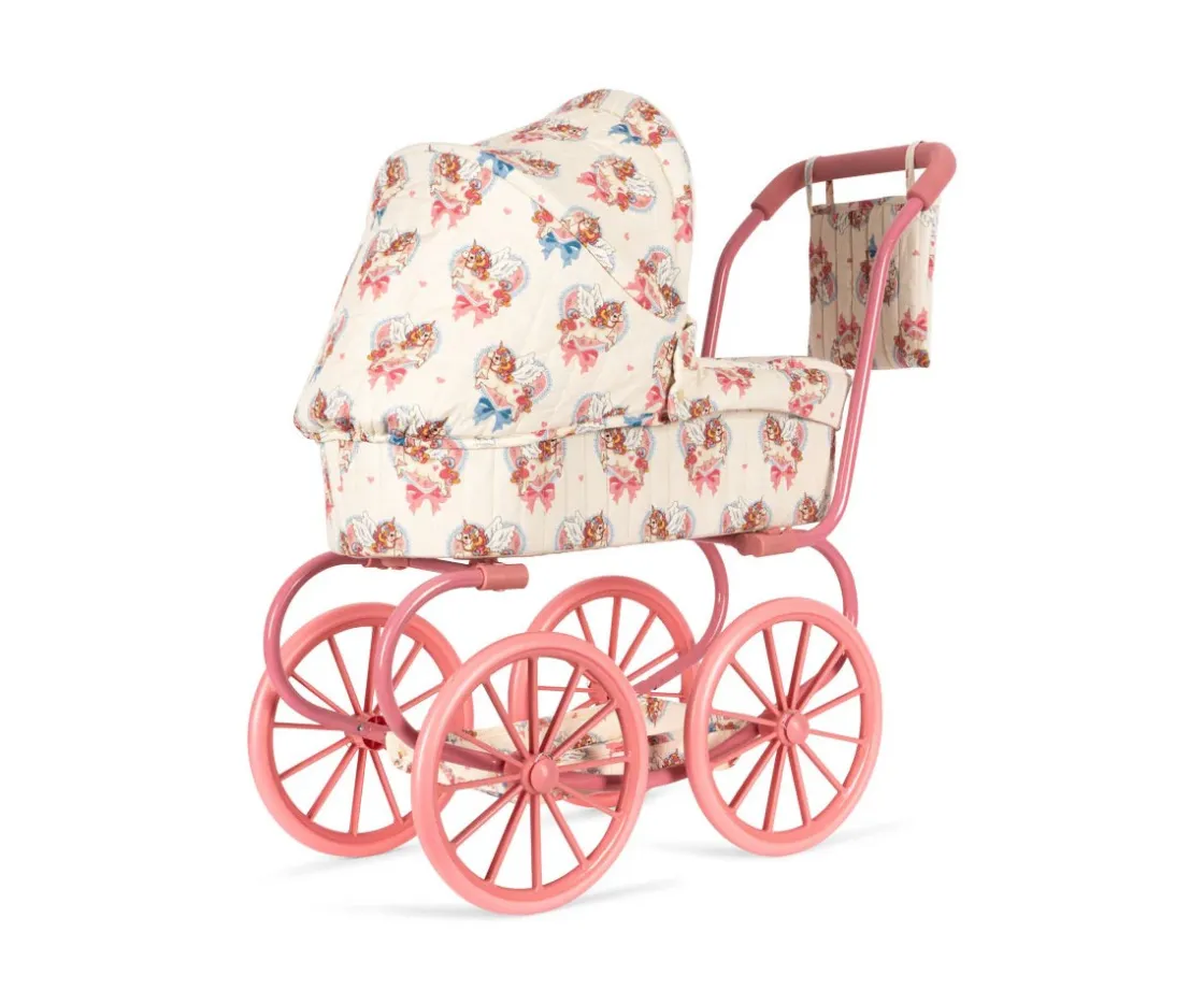 Este carrito de muñecas de Konges Slojd de estilo vintage en una versión más pequeña, con sus cuatro ruedas grandes, ofrece una mayor estabilidad a la hora de pasear a las muñecas. Incluye un colchón y un bolsito para colgar a juego.