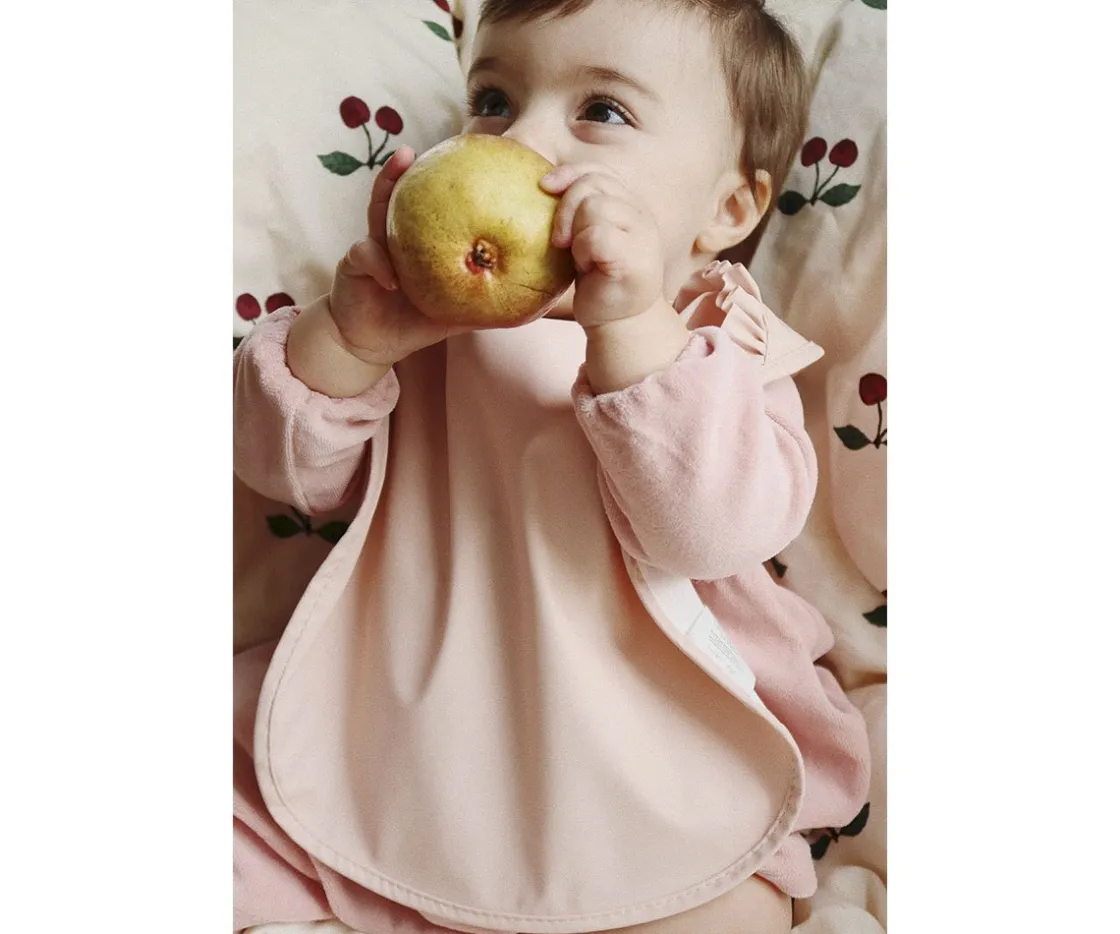 Pack de 2 originales baberos de Konges Slojd fabricados con un tejido fácil de limpiar y repelente al agua. Tiene dos niveles de agarre a presión en el cuello y con precioso detalle de volantes en la parte delantera.