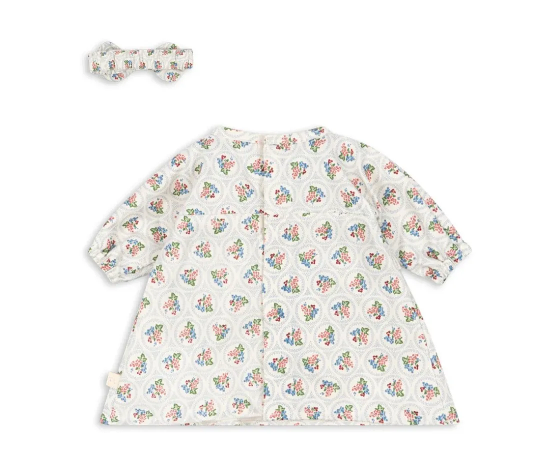 Viste a tu muñeco con este bonito y dulce vestido de suave algodón, con estampado vintage, un precioso volante bajo el pecho y su lacito a juego para la cabeza.