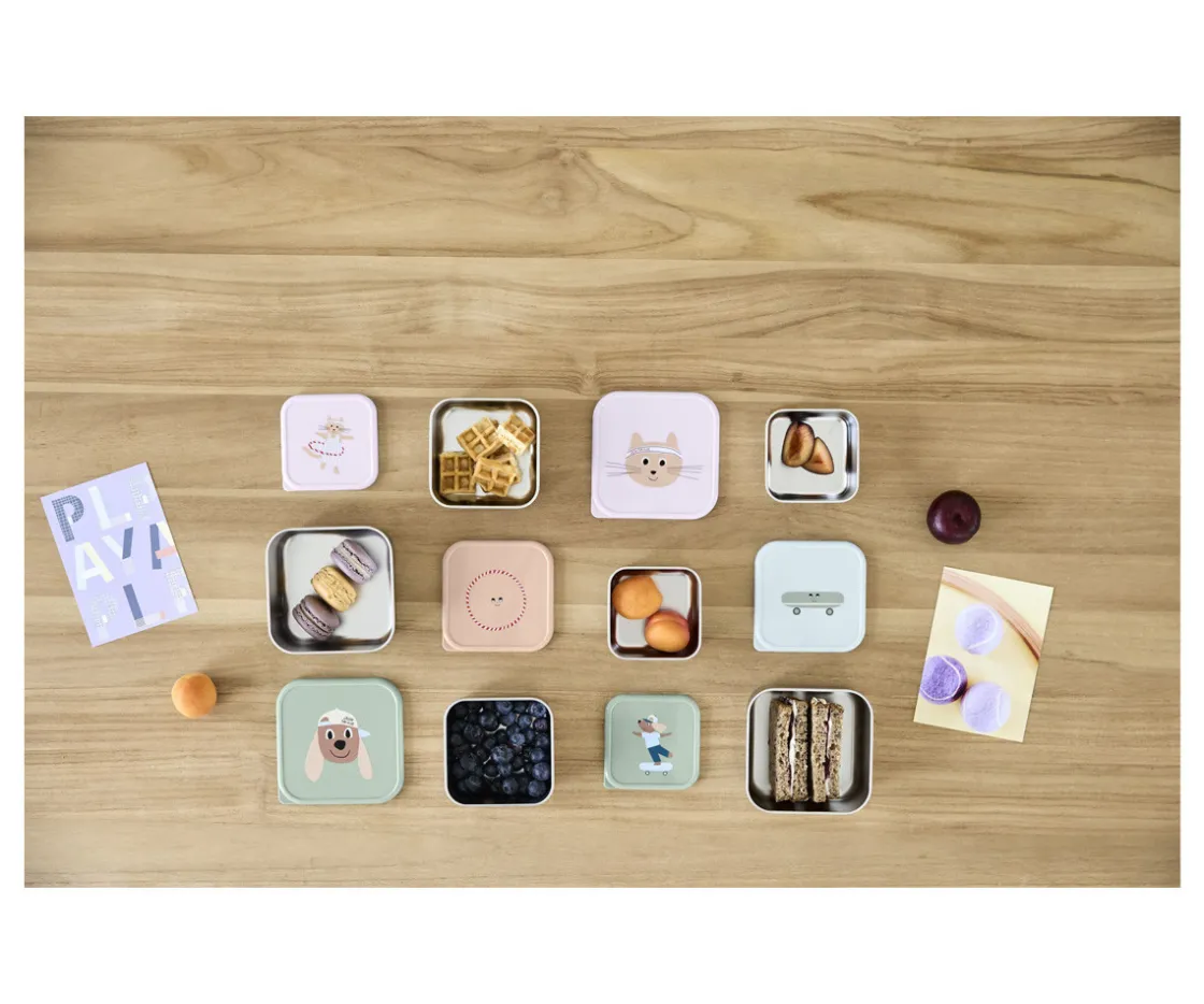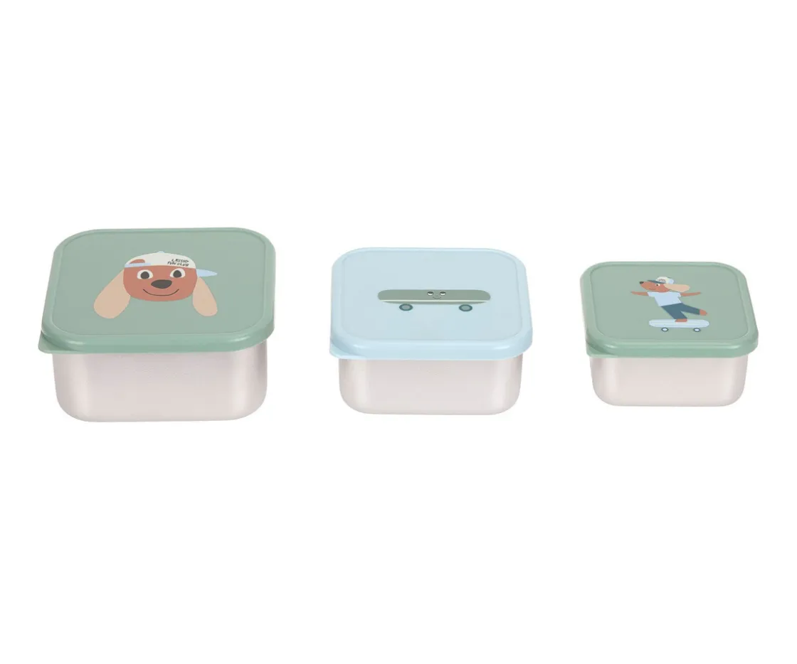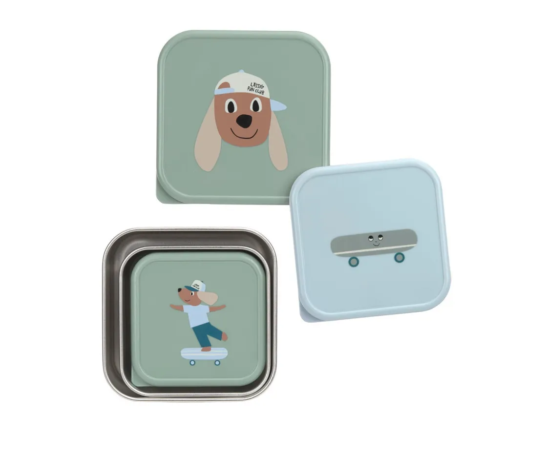 El set de 3 cajas con base de acero inoxidable de LÄSSIG para llevar fruta, verdura y pequeños snacks son ideales para llevar contigo al cole, de excursión o al parque.