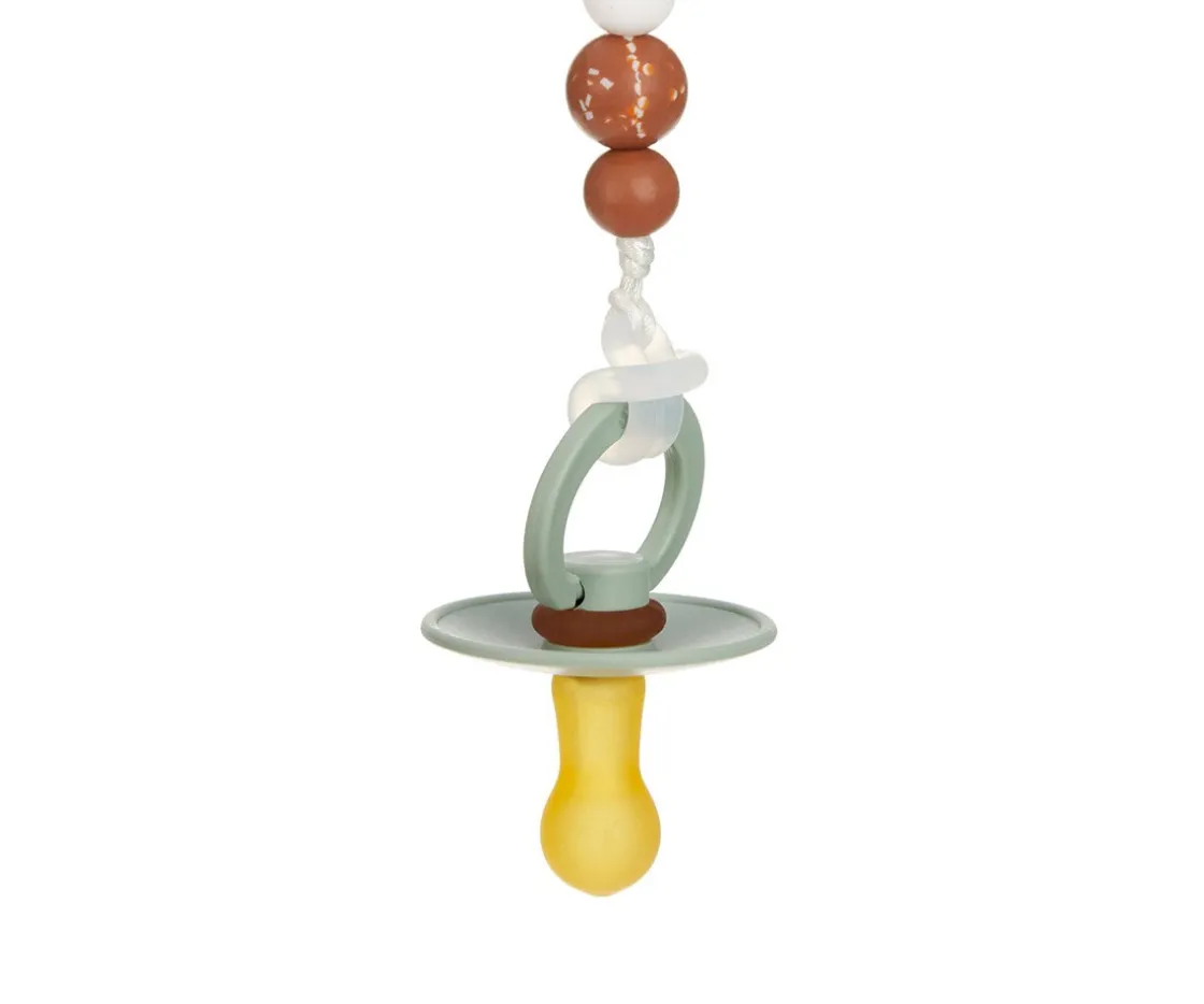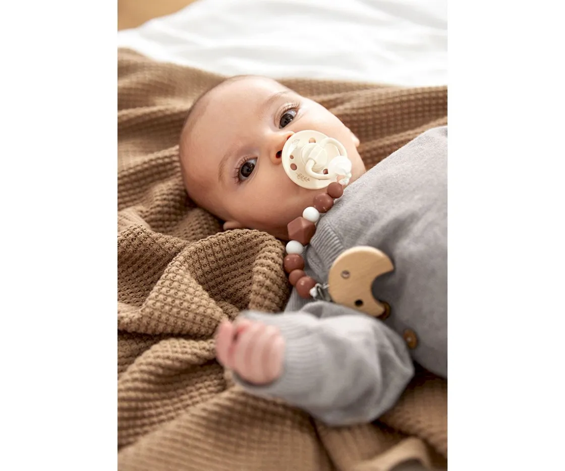 El sujetachupetes LÄSSIG de la colección Little Universe mantiene el chupete siempre a mano. Con un clip de madera, cadena y anillo de silicona, es seguro y fácil de sujetar a la ropa.