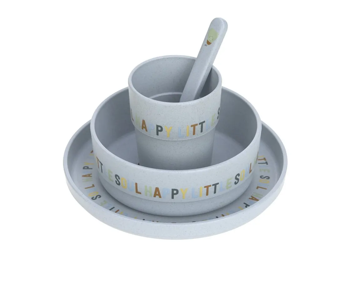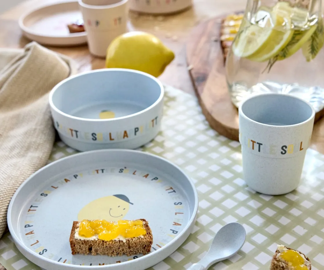 Vajilla de 4 piezas que contiene plato, bol, vaso y cuchara para que los más pequeños se sienten a la mesa. Fabricada con celulosa, un material sostenible, seguro y libre de BPA.