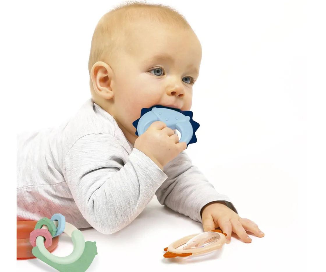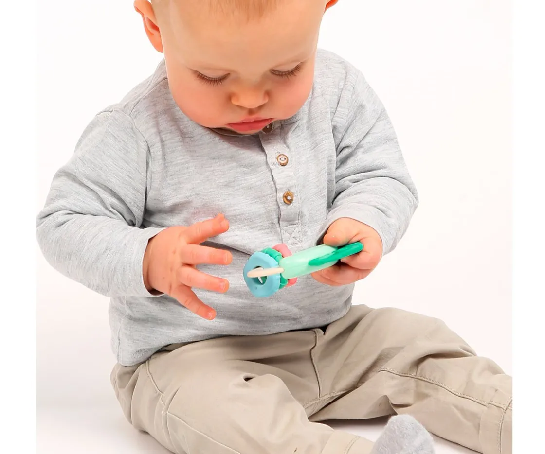 - Sonajero con bordes de silicona para que pueda morderlo cuando esté molesto con las encías