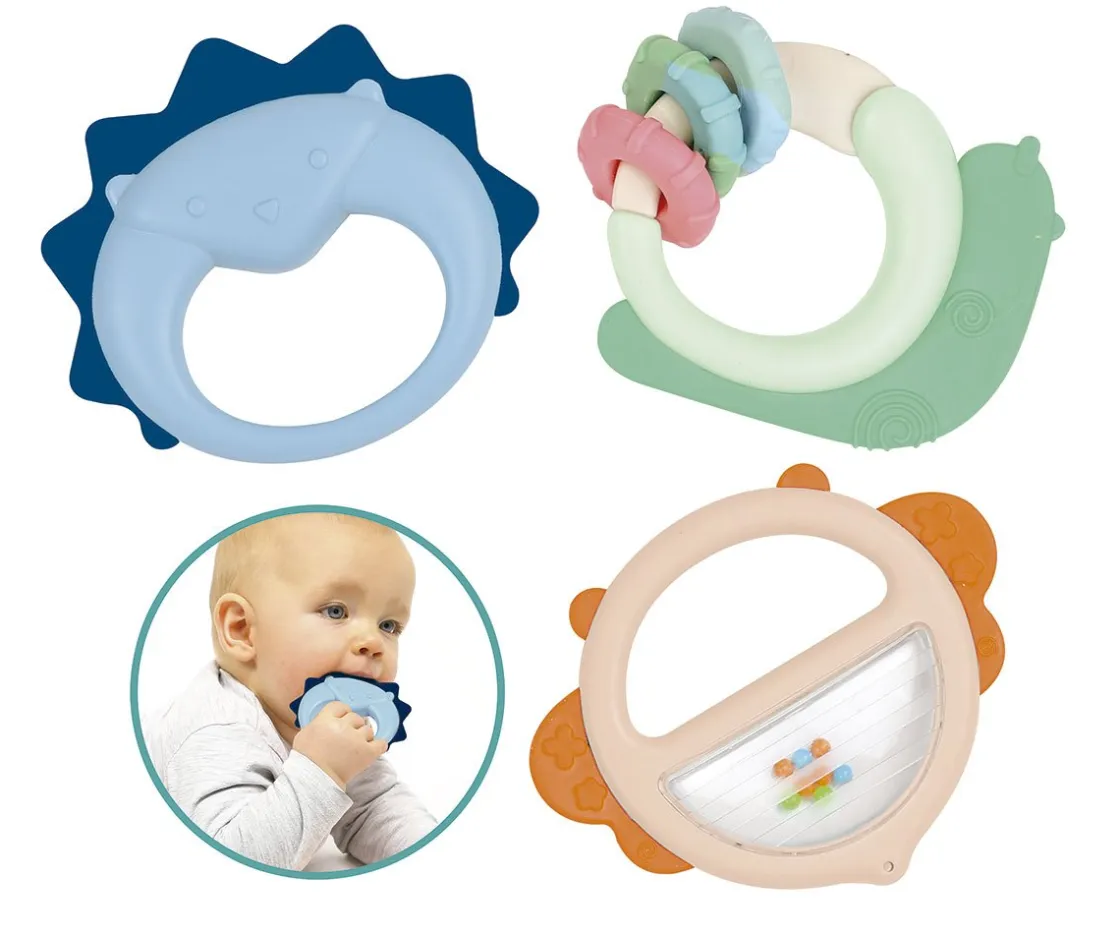 Pack de 3 sonajeros diferentes con distinta función cada uno de ellos.