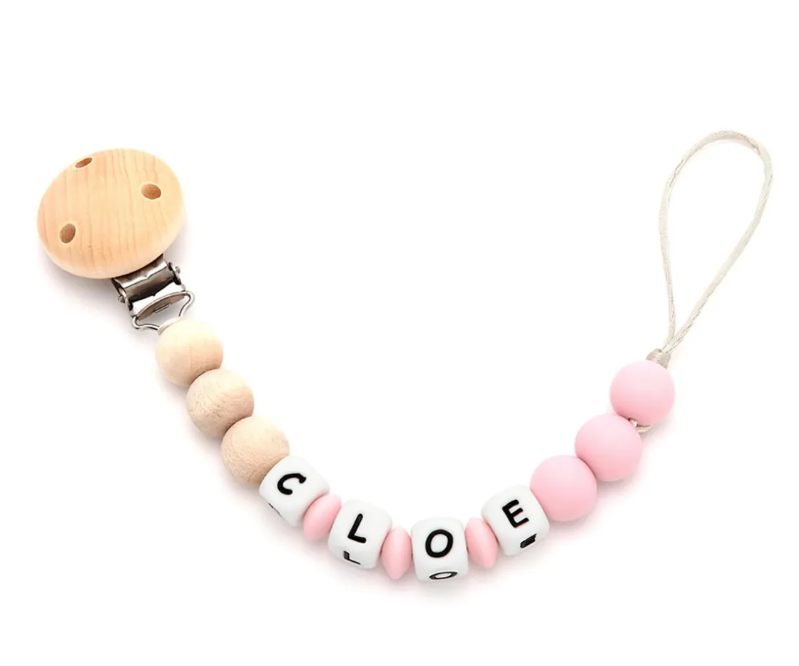 Chupetero 100% mordisqueable de Silicona alimentaria antibacteriana con detalles en madera, personalizable con el nombre del bebé para que sea una pieza única y original.