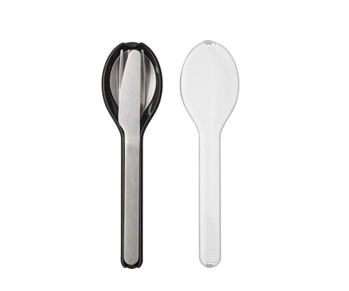 Este práctico set de cubiertos consta de un cuchillo, un tenedor y una cuchara unidos por un soporte de plástico.