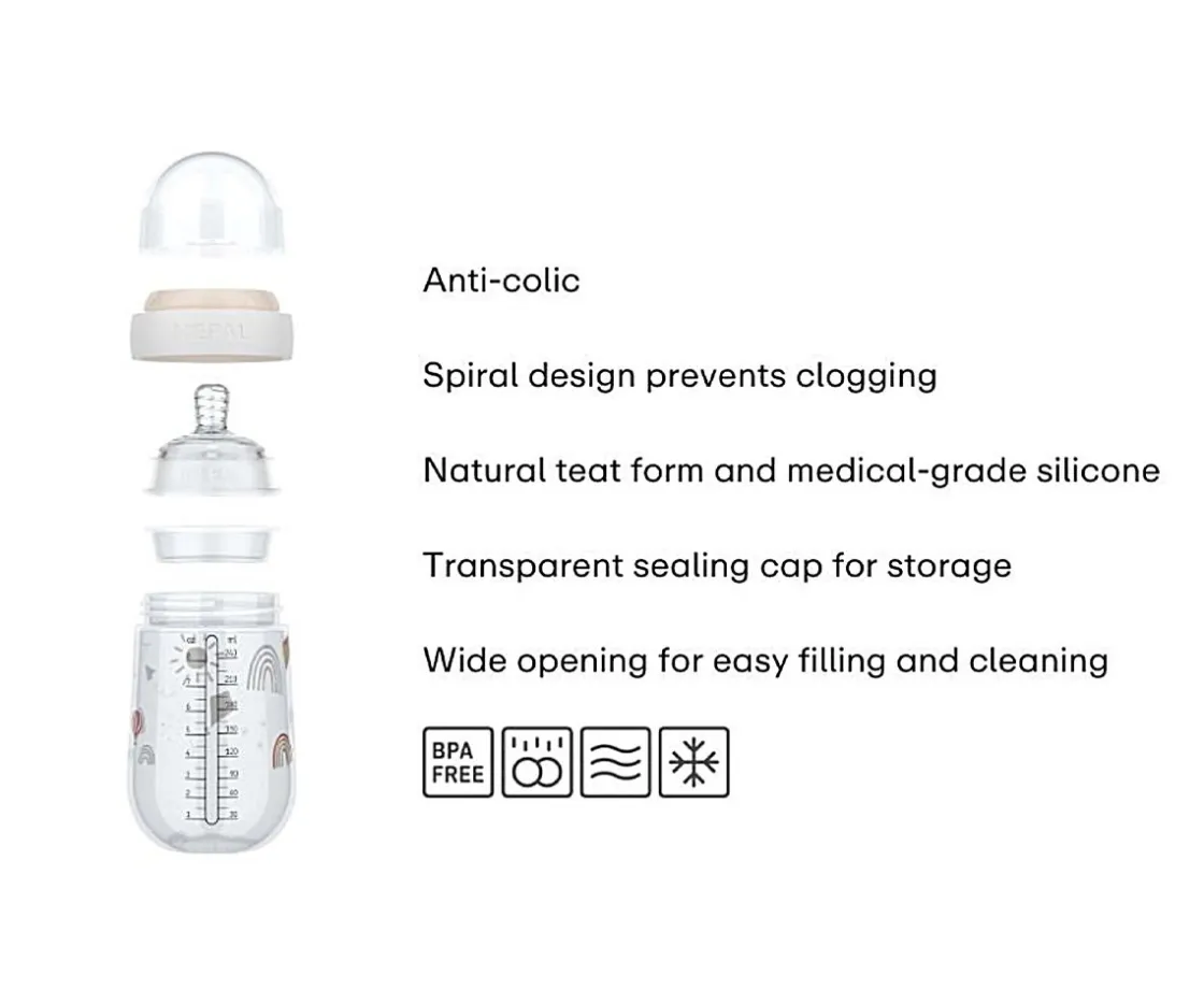 Biberón de la colección Mio Forest Friends de Mepal. Está especialmente diseñado para evitar cólicos y tiene diseño de tetina en espiral para prevenir el bloqueo.