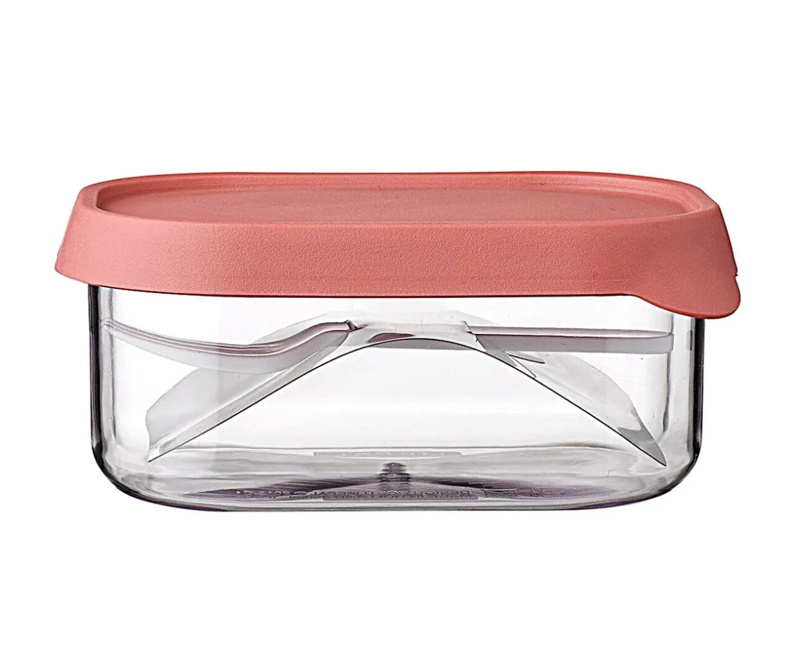 La caja transparente es lo suficientemente grande para llevar troceado una manzana, pera o plátano y encaja en la caja midi Campus.