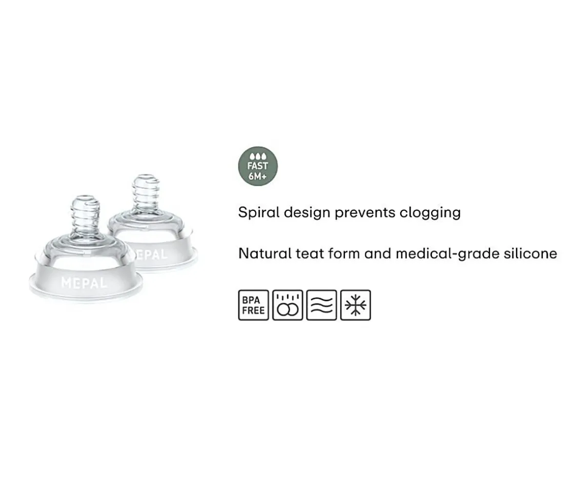 Set de 2 tetinas transparentes para los biberones Mio de Mepal. Podrás tener repuestos y así poder reutilizar el biberón. La tetina está especialmente diseñado para evitar cólicos y su tetina tiene diseño en espiral para prevenir el bloqueo.