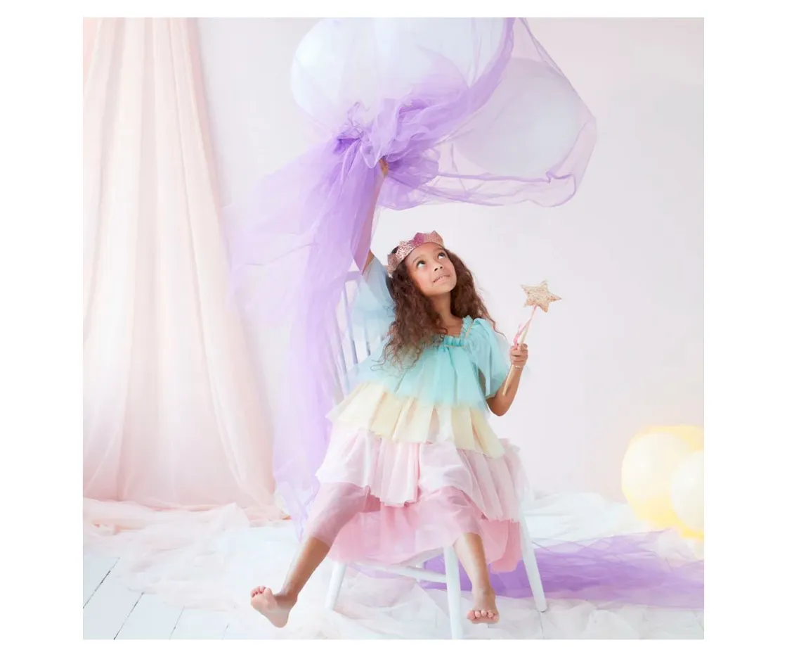 Precioso vestido de colores con volantes y corona dorada ideal para cualquier fiesta.