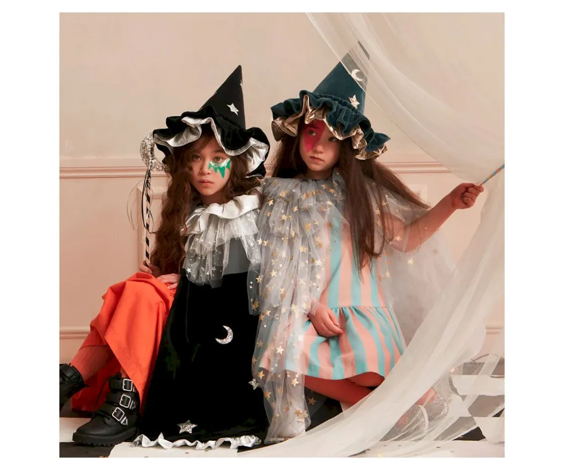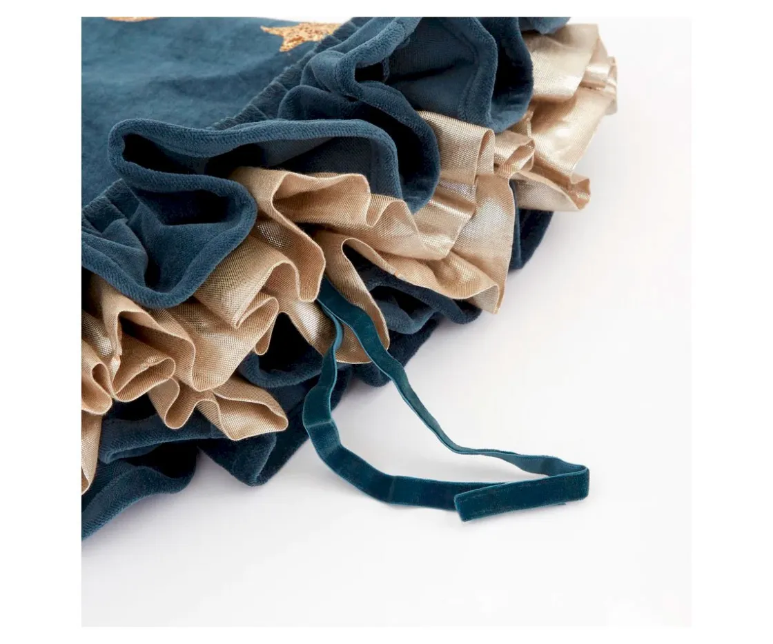 Gorro de terciopelo azul con detalles de volantes, decorado con estrellas y lunas brillantes.