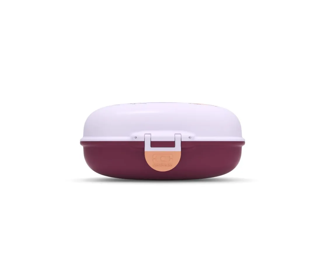 Con un look marcado por su lengüeta de cierre, esta snack box de formas divertidas puede personalizarse gracias a sus fichas intercambiables.