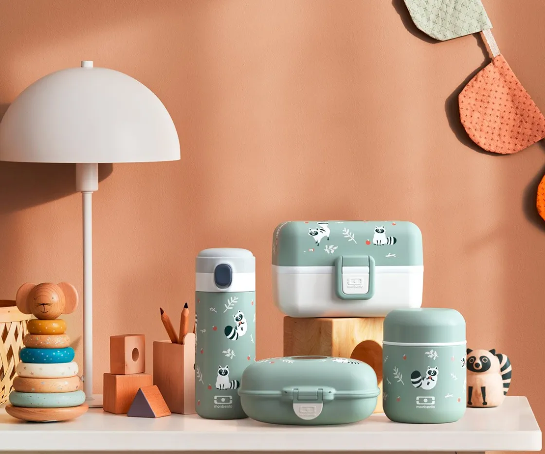 Con un look marcado por su lengüeta de cierre, esta snack box de formas divertidas puede personalizarse gracias a sus pegatinas intercambiables.