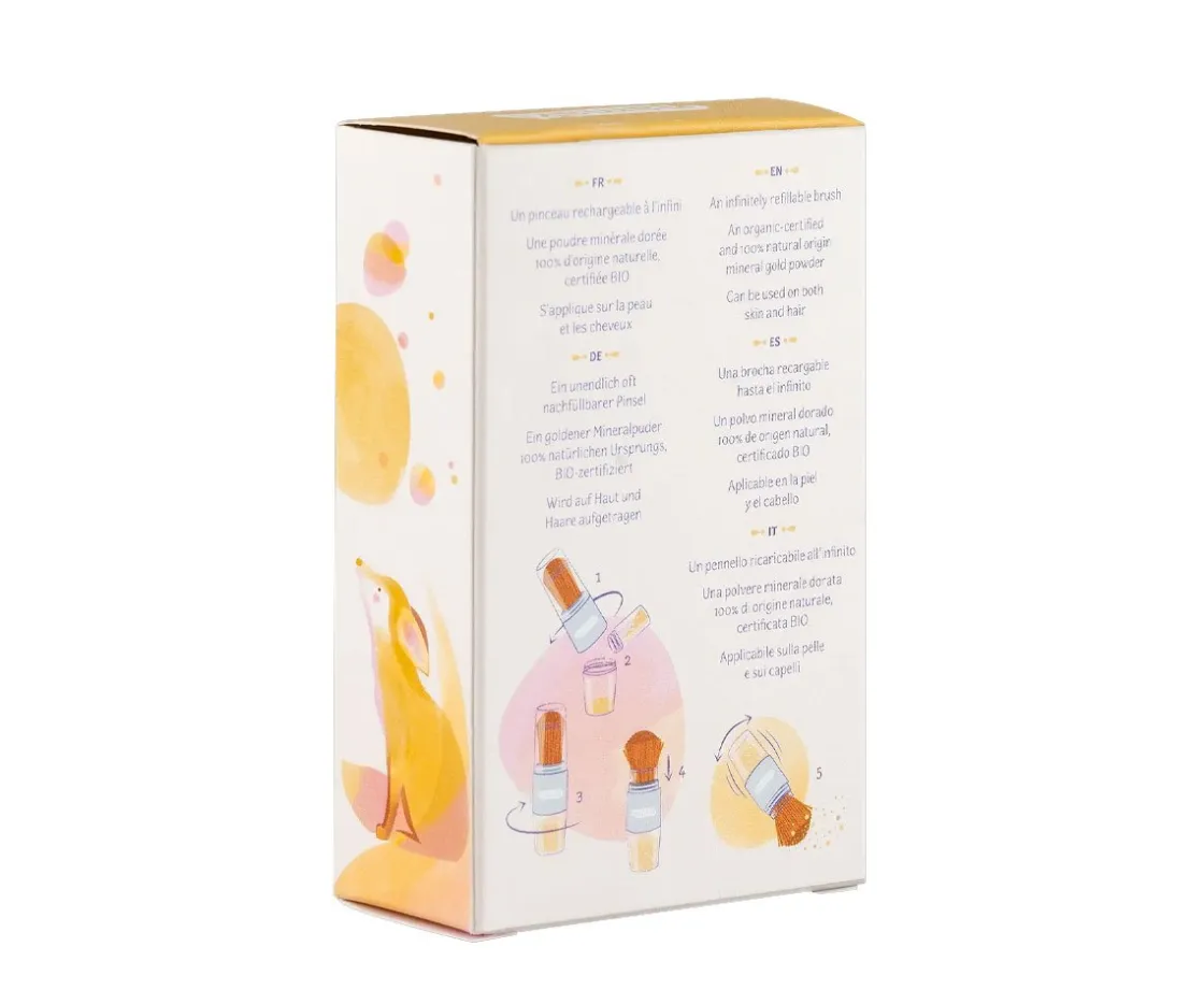 Con la brocha Magic Brush y su polvo brillante de dorado orgánico, los niños pueden brillar de pies a la cabeza.