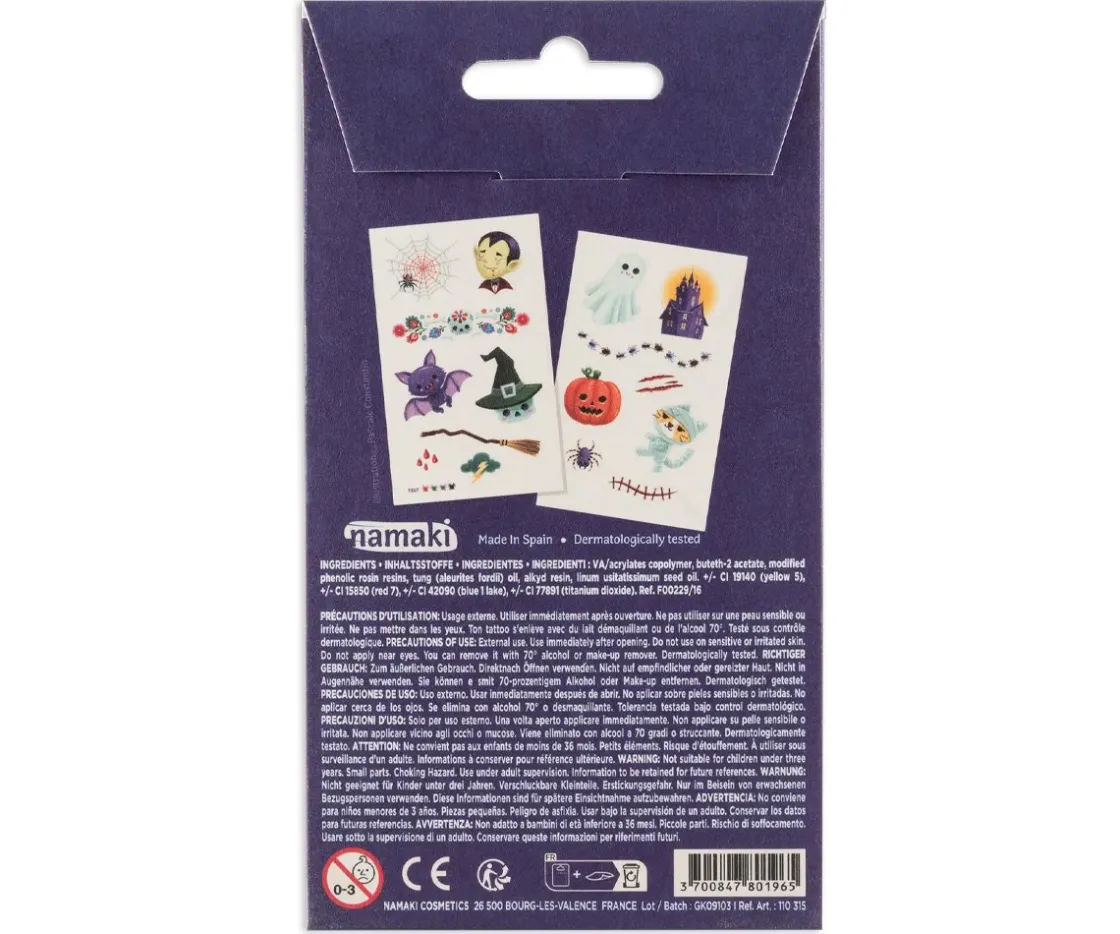 Pásalo en grande y decora tu cuerpo con una hoja de tatuajes temporales de Namaki. Disfruta cualquier fiesta de disfraces y dale una atmósfera escalofriante con murciélagos,fantasmas, vampiros y arañas que incluye este set de tattos.