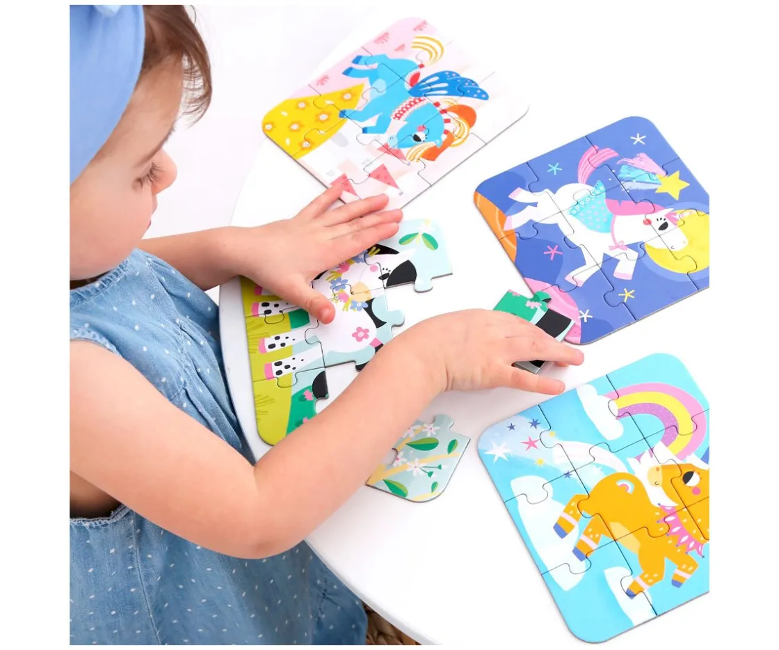 Este original puzzle está formado por 5 rompecabezas de mágicos ponies. Cada ponie está formado por 9 piezas que los peques tendrán que unir.