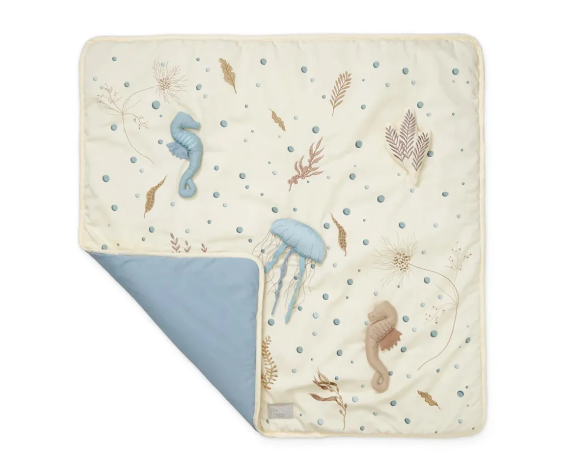 Descubre la suavidad y el encanto de la manta de actividades de Cam Cam, diseñada para estimular los sentidos del bebé a través de detalles cuidadosamente bordados e inspirados en el mágico print Sea Garden.
