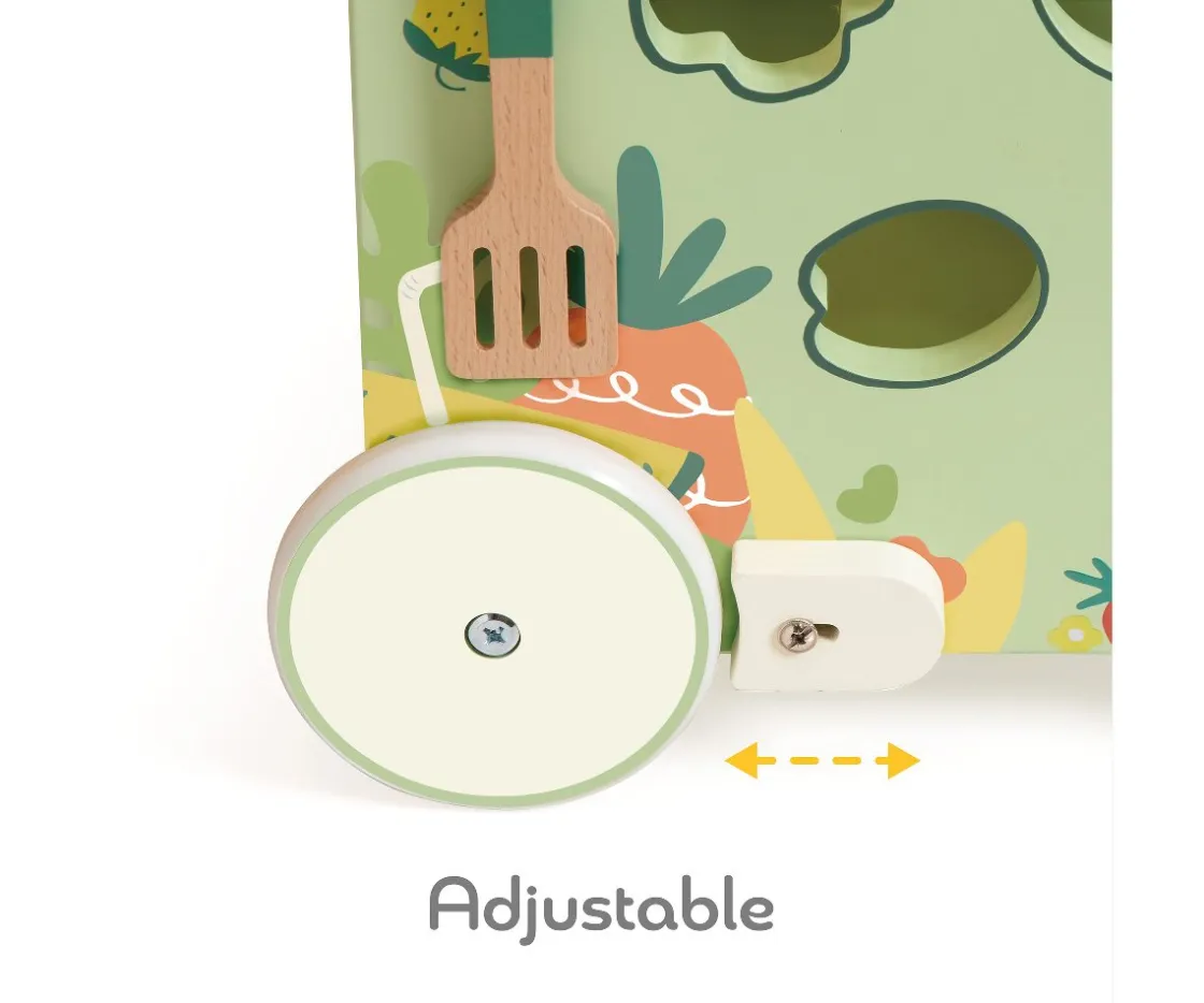Un juguete de madera 2 en 1, un andador multiactividades y a su vez cocina portátil. Es muy resistente y cuenta con gran cantidad de accesorios como un fregadero, una estufa, una sartén, una flor apilable e ingredientes.