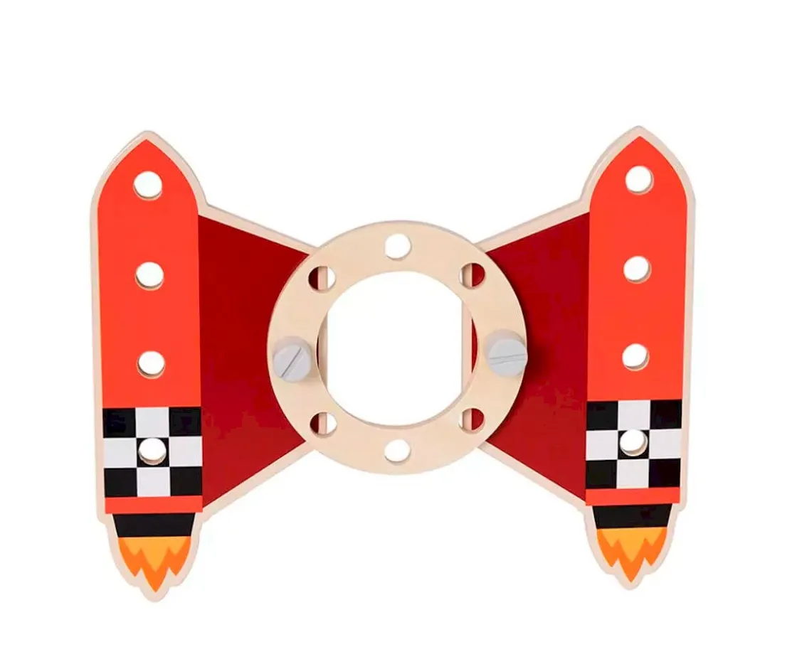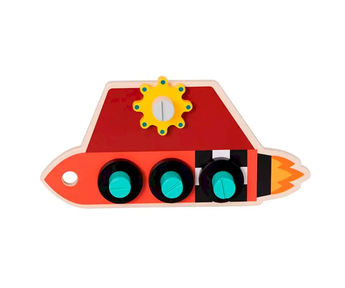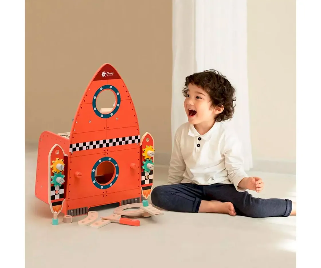 Este original banco de trabajo con forma de cohete permitirá que los peques realicen mientras que juegan, todas sus creaciones.El tablero de la mesa incluye agujeros para facilitar a los peques el manejo de las herramientas.